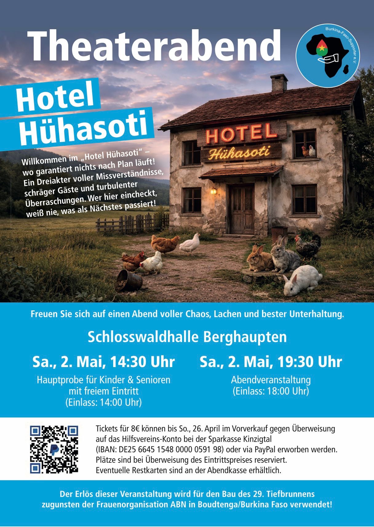 Freuen Sie sich auf einen Abend voller Chaos, Lachen und bester Unterhaltung. Tickets für 8€ können bis zum Sonntag, 26. April im Vorverkauf gegen Überweisung auf das Hilfsvereins-Konto bei der Sparkasse Kinzigtal (IBAN: DE25 6645 1548 0000 0591 98) oder via PayPal erworben werden.